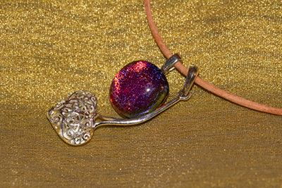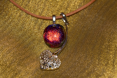 Großer Anhänger aus wunderschönem Dichroid-Glas undt silbernem Anhänger. Die Farbe des Steines schimmert zwischen orange, pink, violett, grün und gelb-gold.