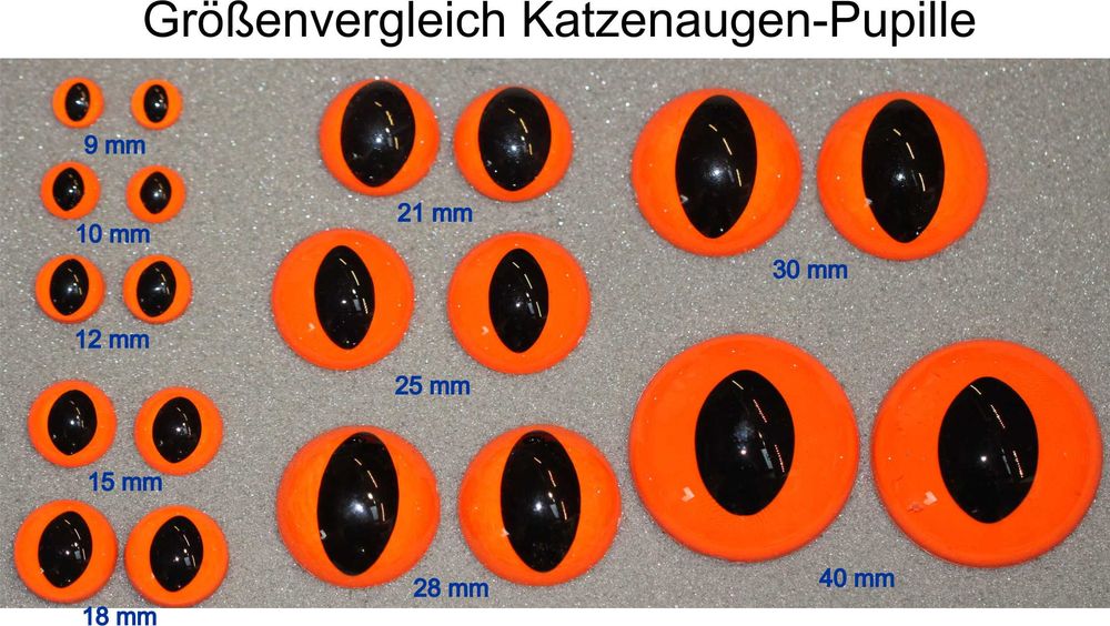 Die Katzen-Sicherheitsaugen sind verfügbar in den Größen 10 mm, 12 mm, 15 mm, 18 mm, 21 mm, 25 mm, 28 mm, 30 mm und 40 mm.
