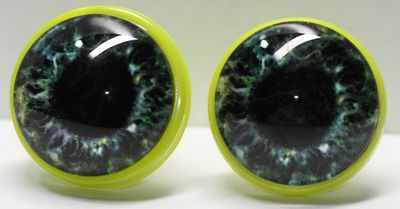 Die Augen haben einen Außendurchmesser von 22 mm, die Glaslinse hat einen Durchmesser von 20 mm.