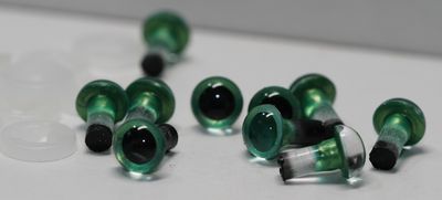 Sonderangebot: 5 Paar Kunststoffaugen 6 mm Pupille transparent - zum Einkleben grün metallic
